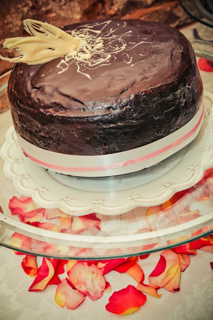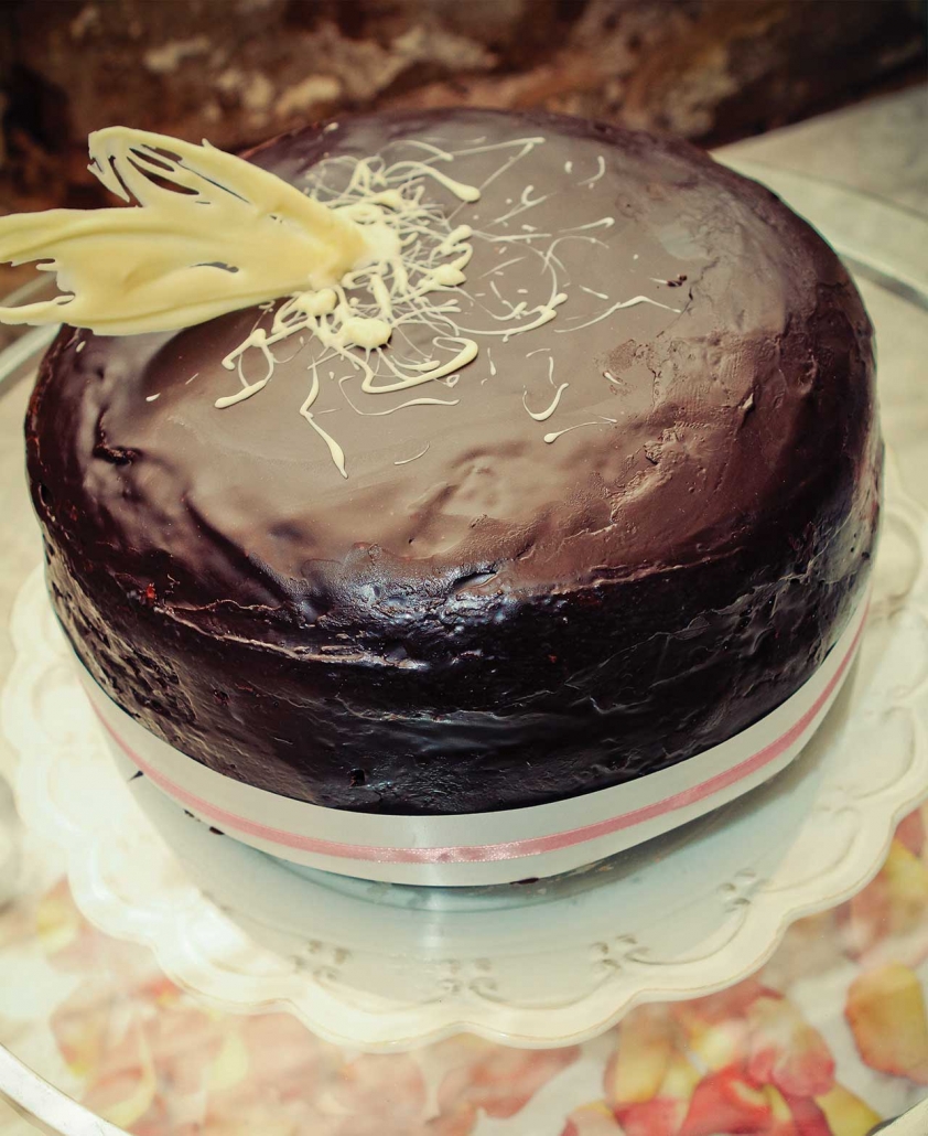 Decadent combination of rich dark chocolate cake, layered with white chocolate mousse and iced with chocolate fudge